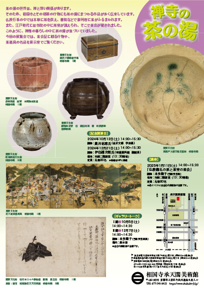 The world of the tea ceremony has a profound connection with Zen Buddhism. For this reason, there are many pieces related to the tea ceremony among the treasures handed down through Shokoku-ji and its branch temples. In Buddhist rituals, tea is offered to the main object of worship, and tea is served to participants in the audience hall, etc. During the Edo period, tea houses were commissioned in the temples, and tea ceremonies were held there. In this way, the tea ceremony existed as a part of the lives of the Zen monks.